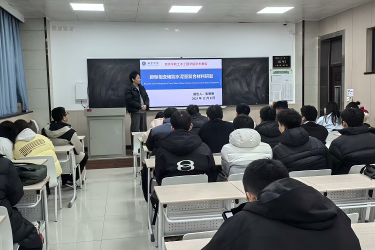 张明明老师带来了“新型相变储能水泥基复合材料研发”的专题报告,从多元相变材料制备、复合材料研发到性能测试与验证模拟进行了系统阐述。他指出,将新型相变材料与建筑材料复合应用,可实现建筑结构的被动式温度调节,有效降低建筑能耗,助力低碳建筑发展。报告中展示的相变参数、力学强度、冻融稳定性等核心数据,以及CFD模拟的温度分布结果,让在场师生对该材料的应用前景有了清晰把握。